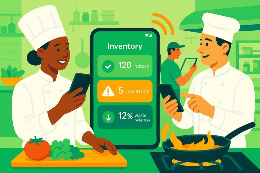Manual inventory management in high-volume kitchens is slow, error-prone, and inefficient. Without real-time sync, inaccuracies cause waste, shortages, and bottlenecks. A mobile, integrated solution was needed to provide instant updates, improve stock control, and free staff to focus on food preparation.